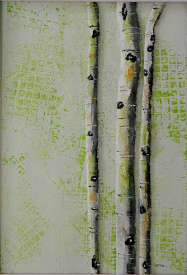 I have been wanting to play with paper cast aspen for EVER!...FINALLY, I took the time to create a simple piece and put it under glass. For those of you who have followed for awhile now you will know that I first made my mold, then poured my casts (shown naked in yesterday's post)...painted them and applied them to the support...which is canvas glued to a support and then covered with modeling paste and then painted and stamped on...FUN!